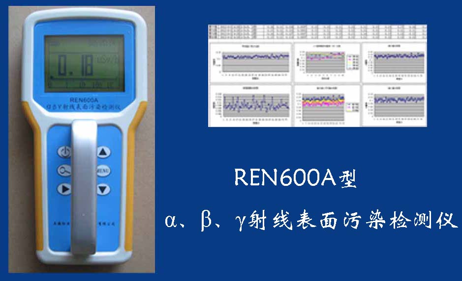 REN600A型α、β、γ射线表面污染仪即可检测α、β、γ射线,也能检测到X射线,它采用高速嵌入式微处器作为数据处理单元,点阵式大屏幕LCD液晶显示,读数清晰、操作方便,具有800条超大容量数据存储。仪器采用进口的大面积MICA盖革探测器,具有较高探测效率,可进行α、β辐射表面污染检测和X、γ辐射剂量率的监测。此外通过配套的RenriCont表面污染管理软件可将存储的数据读出后分析。可广泛用在制药厂、实验室、发电厂、进出口商检、采石场、环境实验室、环境污染调查、核安全应急、紧急状况营救站、金属处理厂、地下油田、供油管道装备、医院核医学科、同位素实验室、环境保护和警察局等部门。REN600A型α、β、γ射线表面污染仪
